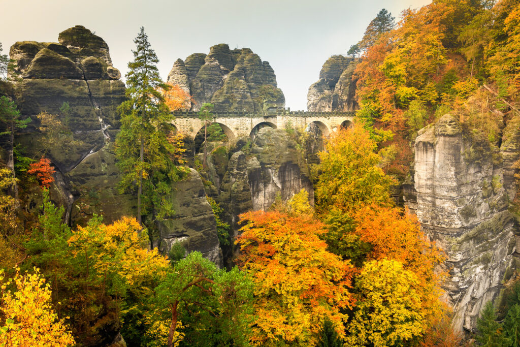 Herbst im Elbsandsteingebirge (Deutschland, Tschechien): Vor allem im Herbst ist ein Besuch des Elbsandsteingebirges nahezu unvergesslich – denn dann wird die üppige Vegetation in bunte Farben getaucht und verwandelt das Gebirge in eine Augenweide, die kein Maler hätte schöner darstellen können. Einen perfekten Überblick über das Farbspektakel erhalten Schaulustige von der Basteibrücke. Neben dem Blick auf saftig-grüne Nadel- und gelb-rötliche Laubwälder sorgt das Elbsandsteingebirge auch durch den direkten Blick auf die Elbe für höher schlagende Herzen.