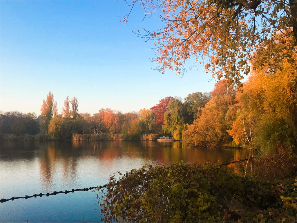 Herbst am Berliner Schäfersee (Deutschland): Der Schäfersee in Berlin-Reinickendorf ist eine wahre Erholungsoase inmitten der Großstadt. Er erstreckt sich über 4,5 ha, was in etwa 6 Fußballfeldern entspricht. In den Sommermonaten lädt der örtliche Bootsverleih zu entspannten Stunden auf dem Wasser ein, während im Café am See die ersten Feierabend-Biere über die Theke gehen.